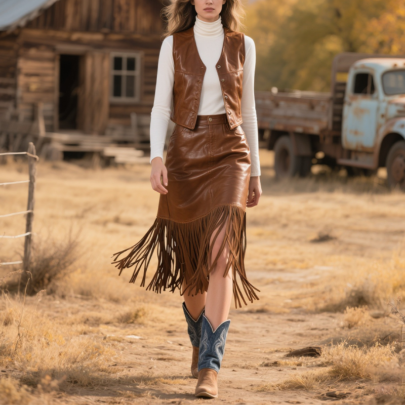 Women's Country Bohemian Leather Fringe Skirt