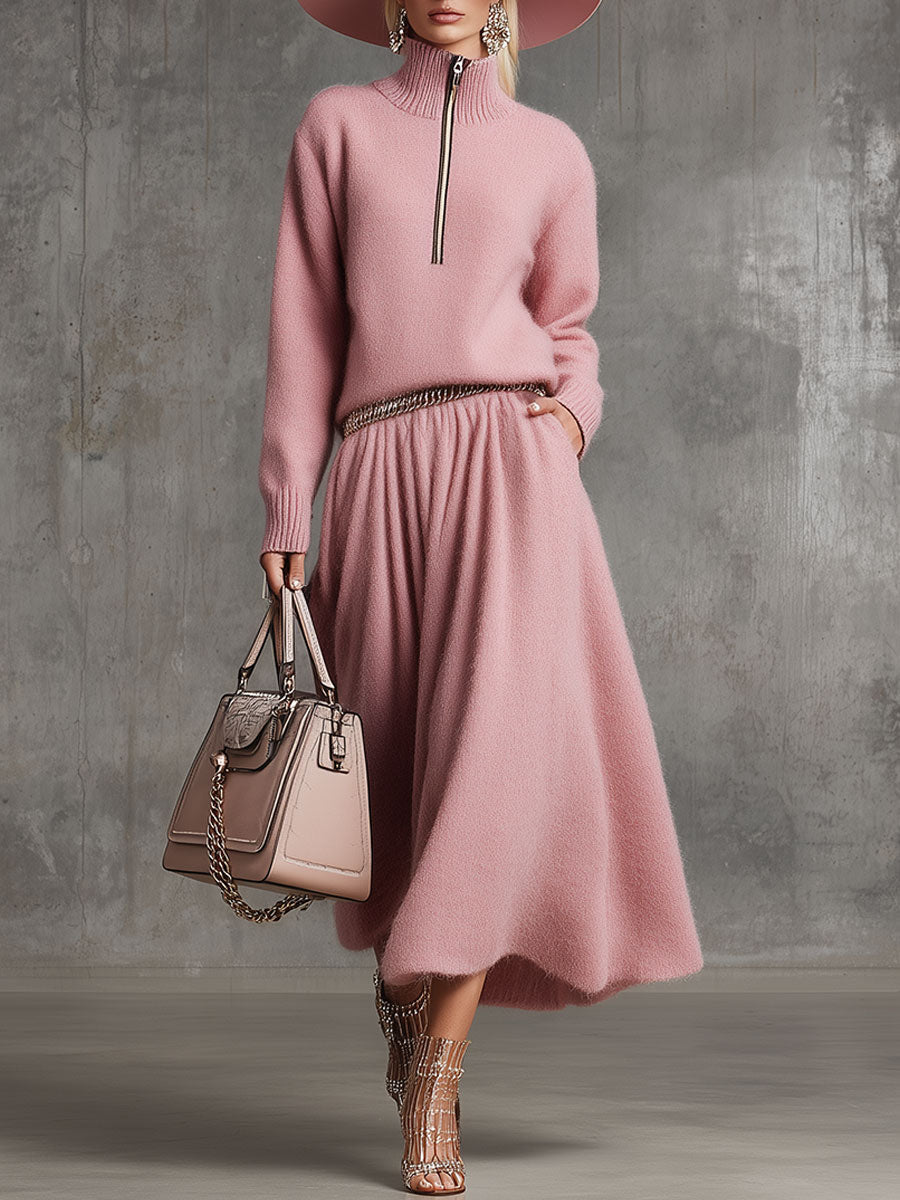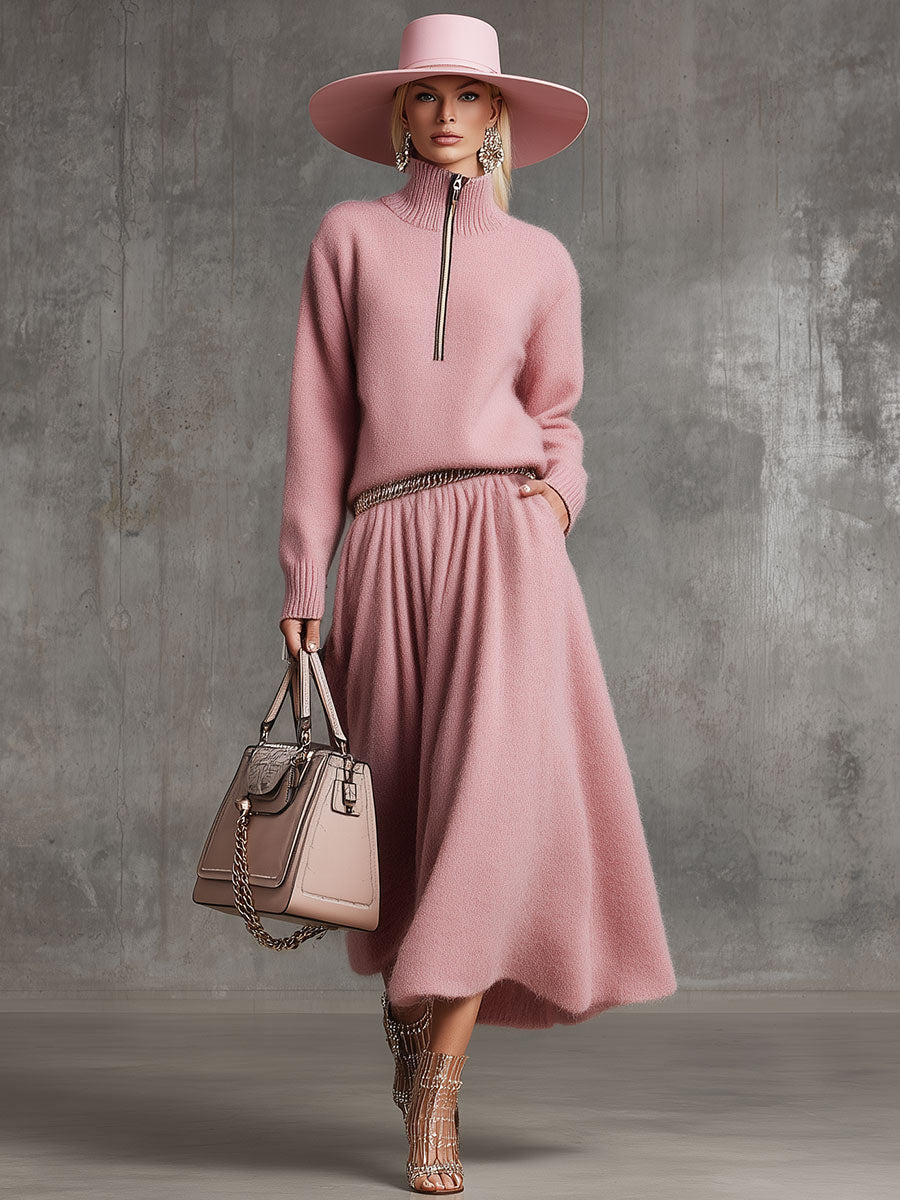 Women's Fashion Round Neck Knitted Sweater Skirt Set