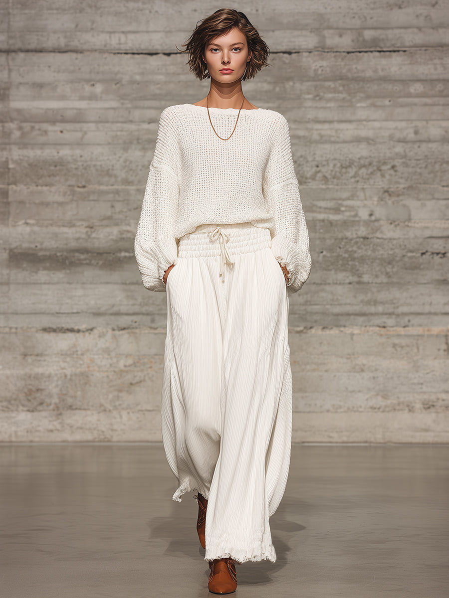Retro Casual White Elastic Waist Wide-leg Pants