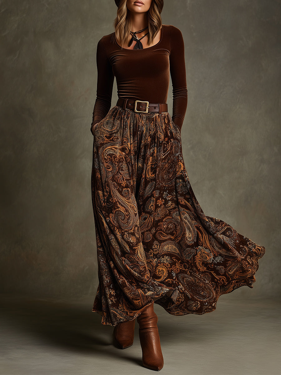 Vintage Stretch Velvet Top & Paisley Print Long Skirt Set With Belt