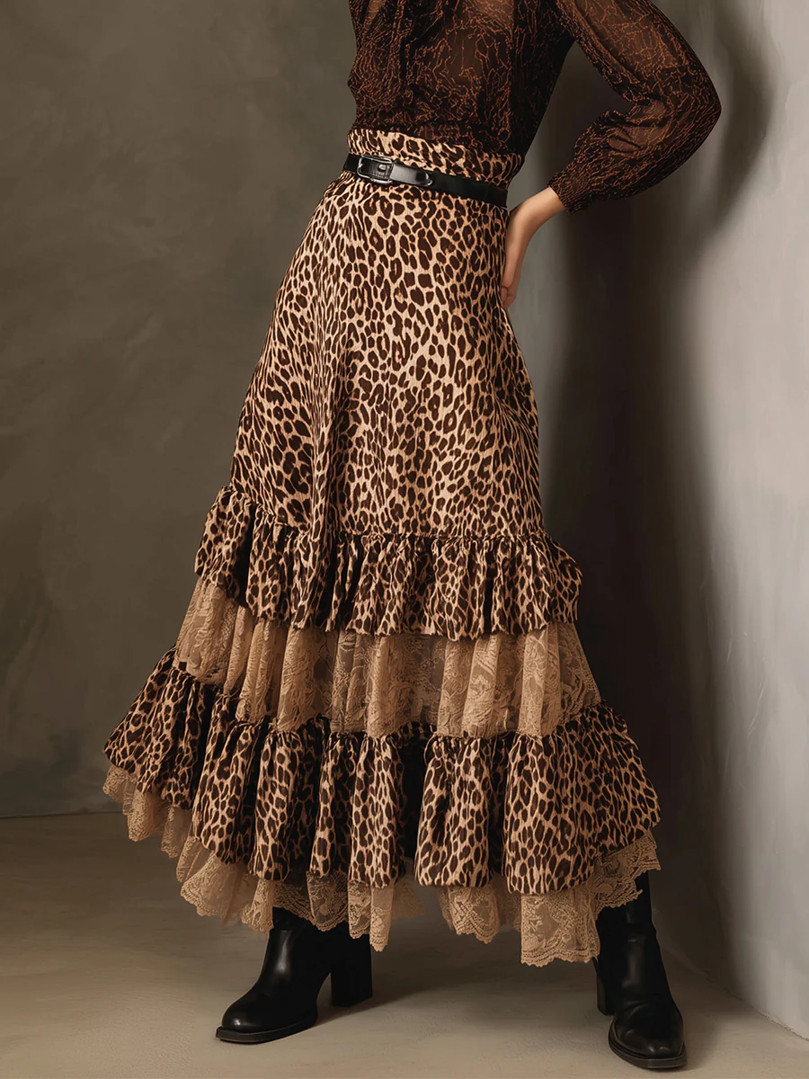 Retro Leopard Lace Ruffled Patchwork Skirt