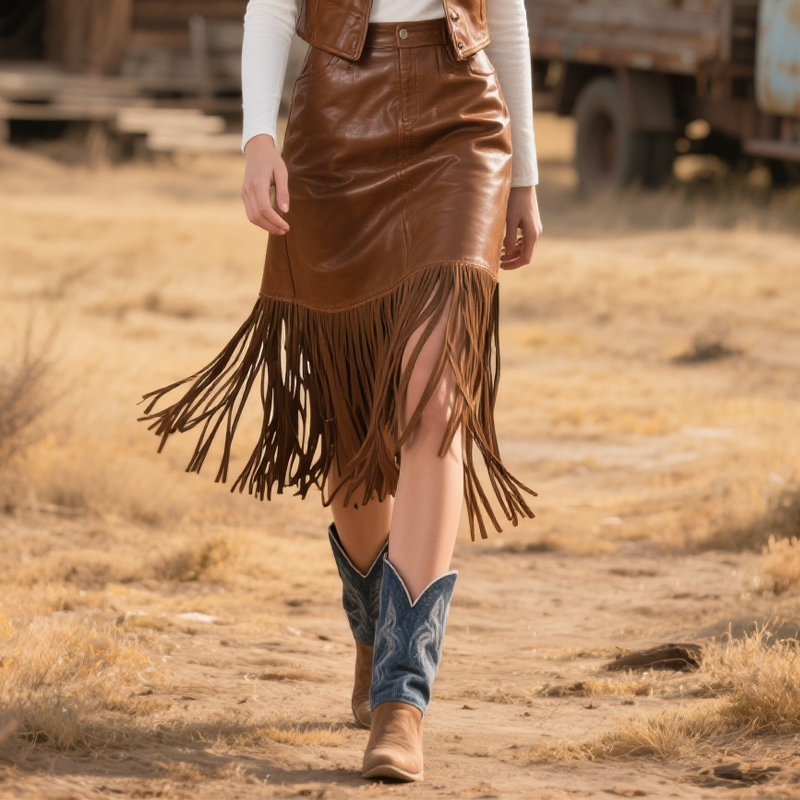 • Designelementer: Asymmetrisk frynsedetalje, knappet vestdesign, høj taljenederdel med sideslids