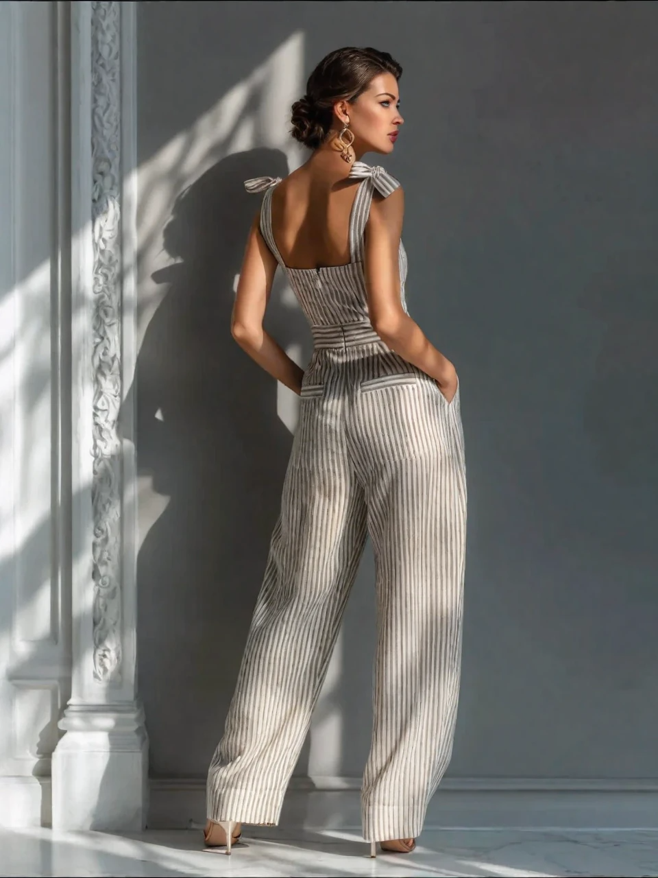 Mühelos schick und zeitlos elegant vereint dieser beige gestreifte Jumpsuit aus Leinen-Mix retro-inspirierte Eleganz mit modernem Komfort. Gefertigt aus einem atmungsaktiven, strukturierten Leinen-Baumwoll-Mix, verfügt er über einen schmeichelhaften quadratischen Ausschnitt, verstellbare Bindeträger, einen taillierten Bund und eine dramatische weite Bein-Silhouette – perfekt für sonnige Tage, Resort-Urlaube und gehobene Freizeitgelegenheiten.