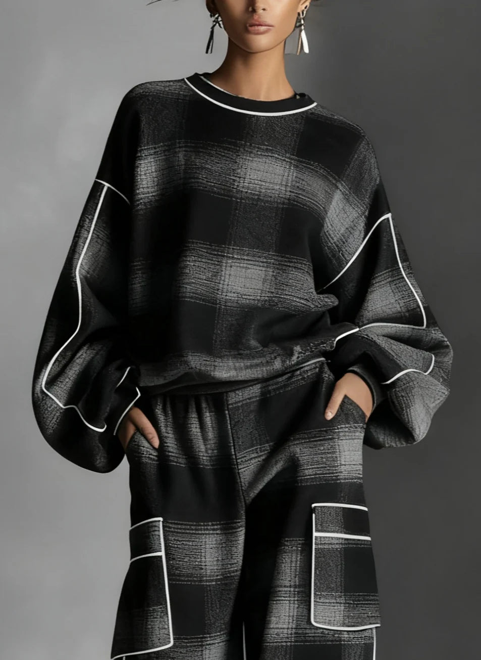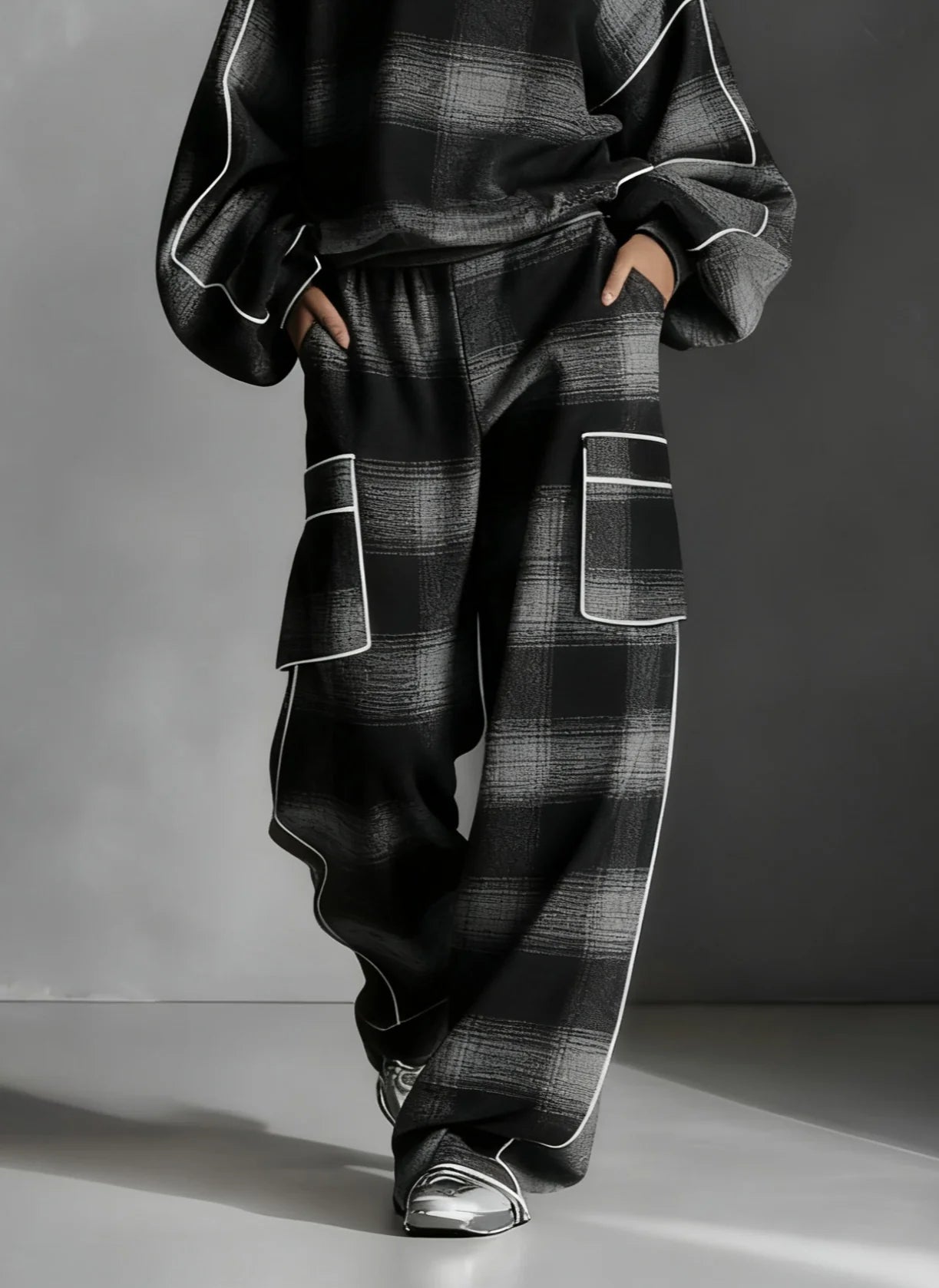 Casual, gedurfd en klaar voor de straat, deze tweedelige set combineert een rood-grijs geruit sweatshirt met bijpassende broek met een ontspannen pasvorm voor een moeiteloze stedelijke uitstraling. De contrasterende biezen verscherpen de silhouet, terwijl de zachte polyesterstof de outfit licht en beweeglijk houdt. Ontworpen in een losse, comfortabele snit, straalt het een coole, relaxte vibe uit die perfect is voor dagelijks gebruik.